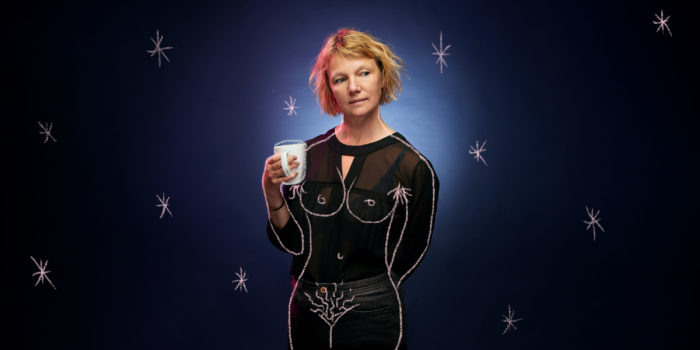 Met humor en zelfspot, met haar hele hart en zonder rol, met lachen door je tranen heen.